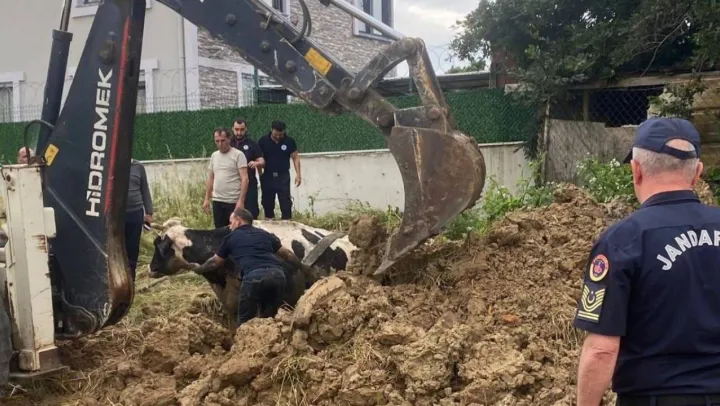 Kuyuya düşen büyükbaş, kepçeyle kurtarıldı