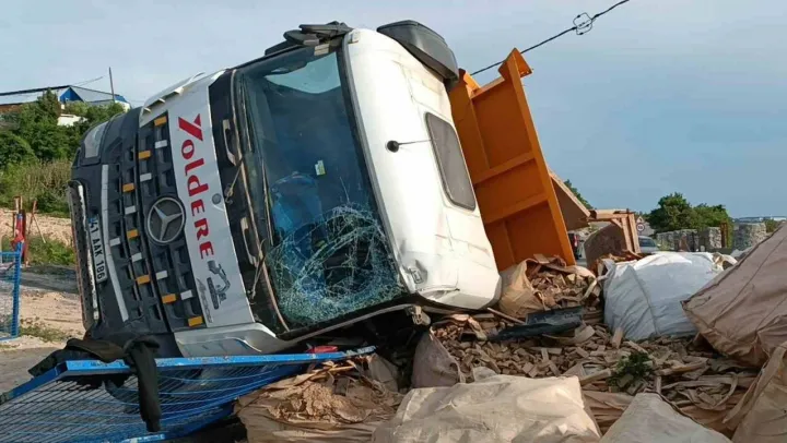 Lastiği patlayan hafriyat kamyonu başka bir araca çarpıp devrildi