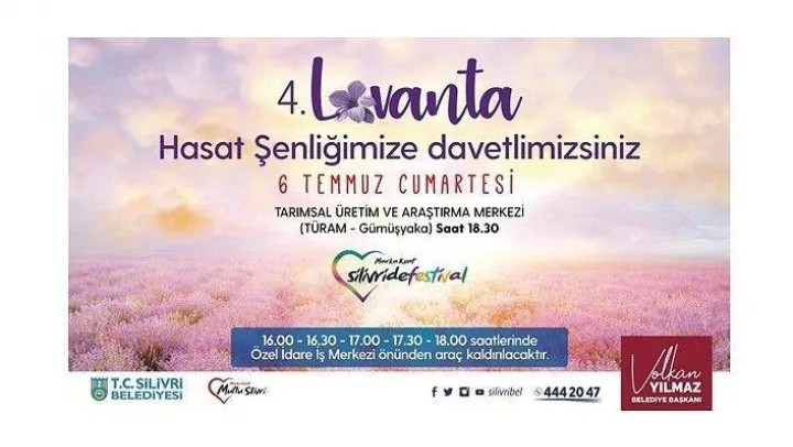 Bugün (6 Temmuz 2019) Gümüşyaka Mahallesi'nde bulunan Silivri Belediyesi Tarımsal Üretim ve Araştırma Merkezi'nde (TÜRAM) gerçekleşecek etkinlikte Silivrililer lavanta tarlalarına girerek hasat yapacak.