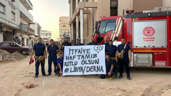 Derne şehrinde görev yapan Balıkesir Büyükşehir Belediyesi itfaiyecileri Balıkesir İtfaiyesi sosyal medya hesabı üzerinden bir fotoğraf paylaşımı yaptılar. Fotoğrafta görevli itfaiye personeli açtıkları pankartta, 'İtfaiye Haftamız kutlu olsun Libya/Derna' yazarak meslektaşlarının İtfaiye Haftası'nı kutladılar.