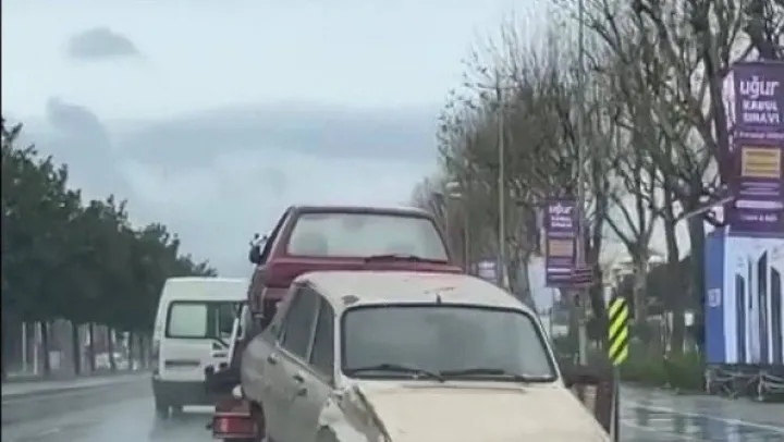 Maltepe'de bir oto çekici, tek araçlık kısmına 2 araç bağlanarak trafikte ilerledi. Çekici şoförünün taşıdığı araçlardan birinin yola sarktığı ve yalpaladığı anlar vatandaşın cep telefonu kamerasına yansıdı.