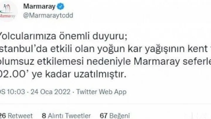 Ulaştırma ve Altyapı Bakanlığı TCDD Taşımacılık Genel Müdürlüğü'nün sosyal medya hesabında yapılan yazılı açıklamada, 'İstanbul'da etkili olan yoğun kar yağışının kent trafiğini olumsuz etkilemesi nedeniyle Marmaray seferleri saat 02.00'ye kadar uzatılmıştır' denildi.