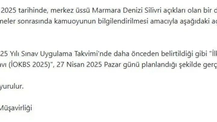 23 Nisan'da merkez üssü Marmara Denizi Silivri açıkları olan bir deprem meydana gelmişti. Yaşanan gelişmeler sonrasında kamuoyunun bilgilendirilmesi amacıyla MEB tarafından bir açıklama yapıldı. MEB'in açıklamasında, İOKBS 2025 sınavının ertelenmeyeceği ve belirlenen tarih olan 27 Nisan'da gerçekleşeceği ifade edildi.