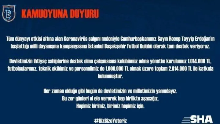 'Tüm dünyayı etkisi altına alan koronavirüs salgını nedeniyle Cumhurbaşkanımız Recep Tayyip Erdoğan'ın başlattığı milli dayanışma kampanyasına İstanbul Başakşehir Futbol Kulübü olarak tam destek veriyoruz.