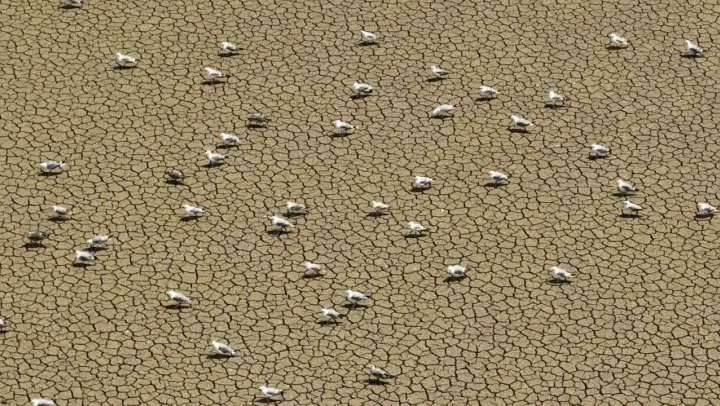 Dron ile havadan çekilen görüntülerde barajdaki su seviyesinin azaldığı ve toprak kısımlarda çatlakların oluştuğu görülüyor.