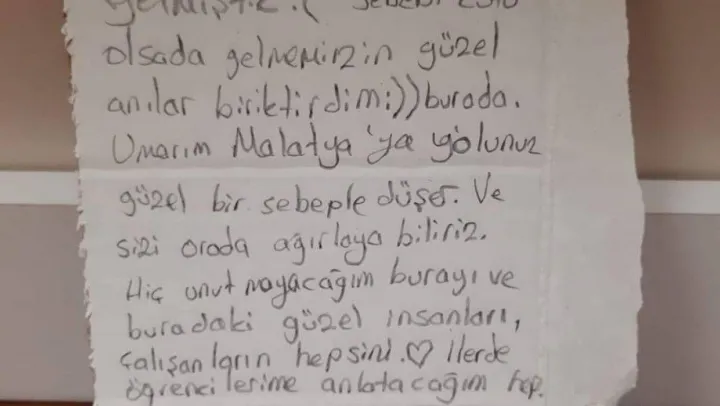 Malatyalı depremzede ayrılmadan evvel bıraktığı notta şu ifadelere yer verdi: 'Merhaba. Biz Malatya'dan gelmiştik. Gelmemizin sebebi kötü olsa da güzel anılar biriktirdim burada. Umarım Malatya'ya yolunuz güzel bir sebeple düşer. Ve sizi orada ağırlayabiliriz. Burayı hiç unutmayacağım. Buradaki güzel insanları, çalışanları hepsini. İleride öğrencilerime anlatacağım. Teşekkür ederim. Emir Sultan KYK ve tüm çalışanları. Zor günlerimizde hep yanımızda oldunuz. Ve tabii ki Bursa Büyükşehir Belediyesi'