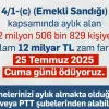 Sosyal Güvenlik Kurumu, sosyal medya hesabından Emekli Sandığı kapsamında aylık alanların zam farkı ödemesine ilişkin açıklama yaptı. Yapılan açıklamada, '4/1-(c) (Emekli Sandığı) kapsamında aylık alan 2 milyon 506 bin 829 kişiye toplam 12 milyar lira zam farkını 25 Temmuz Cuma günü ödüyoruz. Ödemelerinizi aylık almakta olduğunuz banka veya PTT şubelerinden alabilirsiniz' ifadelerine yer verildi.