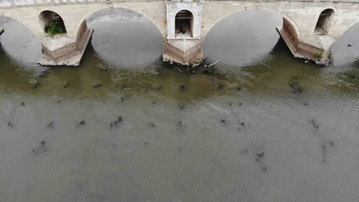 Edirne'nin adeta can damarlarından biri olan Meriç Nehri'nde son yılların en büyük kuraklığının yaşanmasıyla, asırlar önce inşa edilen tarihi ahşap köprünün ayakları su yüzeyine çıktı.