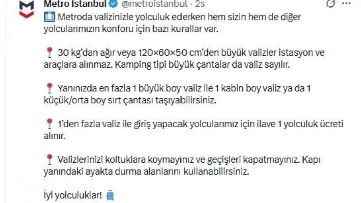 Metro İstanbul'un sosyal medya hesabından yapılan açıklamada, 30 kilogramdan ağır veya belli ebatlardan büyük valizlerin istasyon ve araçlara alınmayacağı buna ek olarak 1'den fazla valiz ile giriş yapacak yolculardan ilave 1 yolculuk ücreti alınacağı belirtildi.