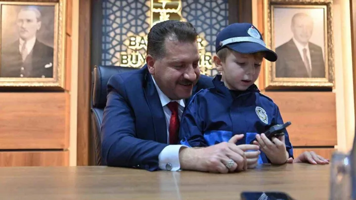 Zabıta Teşkilatı'nın kuruşunun 197'nci yıl dönümü nedeniyle minik çocuklar üstlerinde zabıta kıyafeti, ellerinde telsizlerle Büyükşehir Belediye Başkanı Yücel Yılmaz'ı ziyaret etti. Minikler, Başkan Yılmaz ile birlikte telsizden anons geçerek tüm zabıtaların haftasını kutladı.