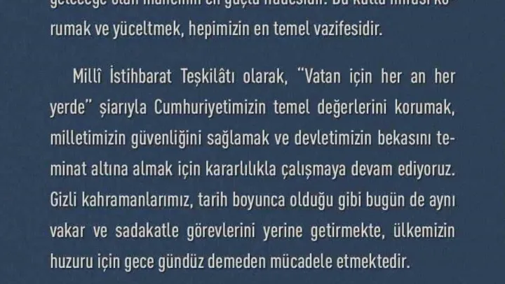 'Cumhuriyetimizin kuruluşunun 102. yıl dönümünü milletçe büyük bir gurur ve coşkuyla idrak ediyoruz. Cumhuriyet, aziz milletimizin bağımsızlık iradesinin ve ortak geleceğe olan inancının en güçlü ifadesidir. Bu kutlu mirası korumak ve yüceltmek, hepimizin en temel vazifesidir. Milli İstihbarat Teşkilatı olarak 'Vatan için her an her yerde' şiarıyla Cumhuriyetimizin temel değerlerini korumak, milletimizin güvenliğini sağlamak ve devletimizin bekasını teminat altına almak için kararlılıkla çalışmaya devam ediyoruz. Gizli kahramanlarımız, tarih boyunca olduğu gibi bugün de aynı vakar ve sadakatle görevlerini yerine getirmekte, ülkemizin huzuru için gece gündüz demeden mücadele etmektedir. Bu anlamlı günde başta Cumhuriyetimizin banisi Gazi Mustafa Kemal Atatürk ve silah arkadaşları olmak üzere tüm şehit ve gazilerimizi rahmet ve minnetle anıyor, aziz milletimizin Cumhuriyet Bayramı'nı en içten dileklerimle kutluyorum.'