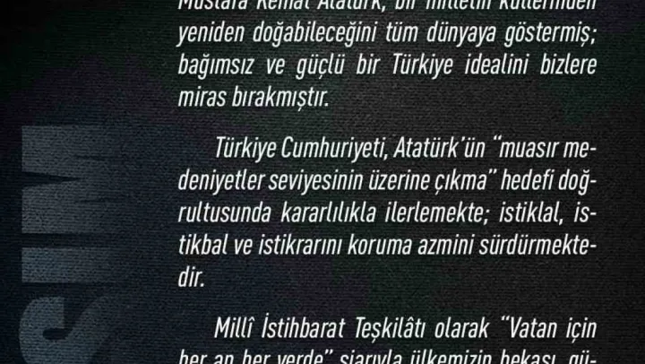 'Cumhuriyetimizin bnisi Gazi Mustafa Kemal Atatürk'ü, ebediyete irtihalinin 87. yıl dönümünde saygı ve rahmetle anıyorum. Aziz milletimizin asil ruhunu ve birlik azmini temsil eden Millî Mücadelenin Başkomutanı Gazi Mustafa Kemal Atatürk, bir milletin küllerinden yeniden doğabileceğini tüm dünyaya göstermiş; bağımsız ve güçlü bir Türkiye idealini bizlere miras bırakmıştır. Türkiye Cumhuriyeti, Atatürk'ün 'muasır medeniyetler seviyesinin üzerine çıkma' hedefi doğrultusunda kararlılıkla ilerlemekte; istiklal, istikbal ve istikrarını koruma azmini sürdürmektedir. Millî İstihbarat Teşkiltı olarak 'Vatan için her an her yerde' şiarıyla ülkemizin bekası, güvenliği ve huzuru için azim ve gayretle çalışmayı sürdürüyoruz. Bu vesileyle Gazi Mustafa Kemal Atatürk'ü ve tüm silah arkadaşlarını ve vatan uğruna can veren tüm şehitlerimizi rahmet, hürmet ve şükranla yd ediyorum.'