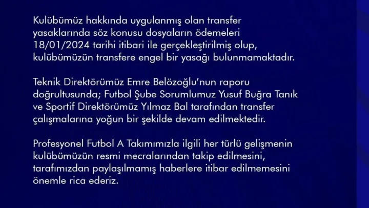 'Kulübümüz hakkında uygulanmış olan transfer yasaklarında söz konusu dosyaların ödemeleri 18/01/2024 tarihi itibari ile gerçekleştirilmiş olup, kulübümüzün transfere engel bir yasağı bulunmamaktadır. Teknik Direktörümüz Emre Belözoğlu'nun raporu doğrultusunda; Futbol Şube Sorumlumuz Yusuf Buğra Tanık ve Sportif Direktörümüz Yılmaz Bal tarafından transfer çalışmalarına yoğun bir şekilde devam edilmektedir. Profesyonel Futbol A Takımımızla ilgili her türlü gelişmenin kulübümüzün resmi mecralarından takip edilmesini, tarafımızdan paylaşılmamış haberlere itibar edilmemesini önemle rica ederiz.'