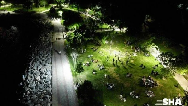 Koronavirüsle mücadele kapsamında getirilen hafta sonu sokağa çıkma kısıtlamasının sona erdirilmesiyle birlikte, vatandaşlar gün boyu sahilleri doldururken gece boyu da Moda Sahilindeki yoğunluk devam etti. Moda sahilde yürüyüş yapan ve oturan vatandaşlar drone ile havadan görüntülendi.
