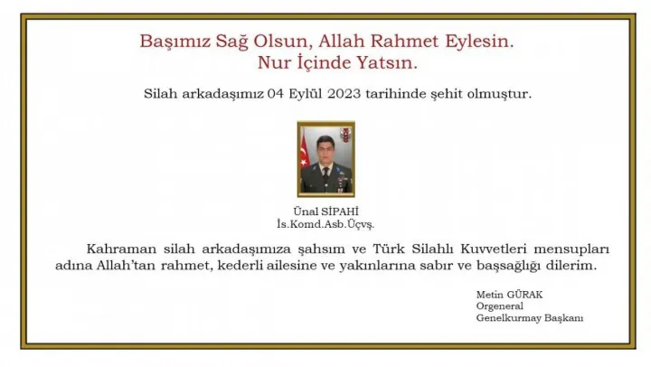 Bizleri derin bir acı ve üzüntüye boğan bu olayda, hayatını kaybeden aziz şehidimize Allah'tan rahmet, kederli ailesine, Türk Silahlı Kuvvetleri ile asil milletimize başsağlığı ve sabır, yaralı personelimize de acil şifalar dileriz' ifadelerine yer verildi.