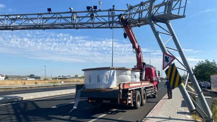 Muratlı'da vinç otoyol plaka tanıma sitemi direğine çarptı