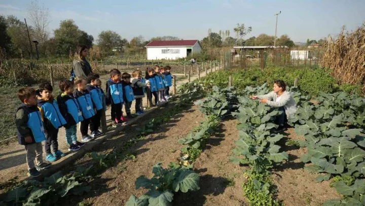 Nilüfer Belediyesi'nin Ürünlü Mahallesi'nde ekolojik tarım koşullarında üretim yaptığı Kent Bostanları, anaokulu öğrencilerini ağırladı.