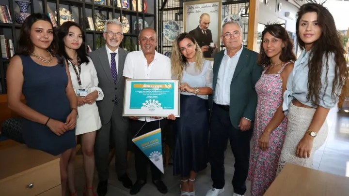 'Örnek İş Yeri' belgesini, programa katılan Bozcaada Belediye Başkanı Dr. Hakan Can Yılmaz ile birlikte işletmeci Özcan Dilekyiğit'e veren Başkan Erdem, firma çalışanlarını da kutladı.