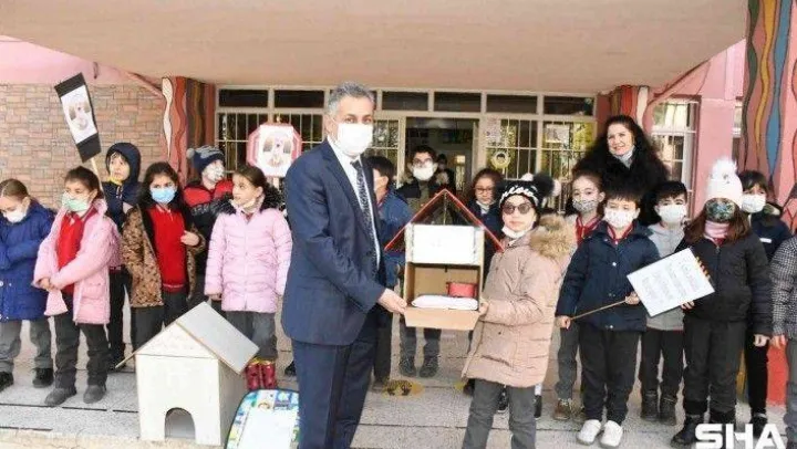 Bursa'nın İznik ilçesinde, ilkokul öğrencileri, kendi elleriyle hazırladıkları kedi yuvalarını okullara teslim etti.