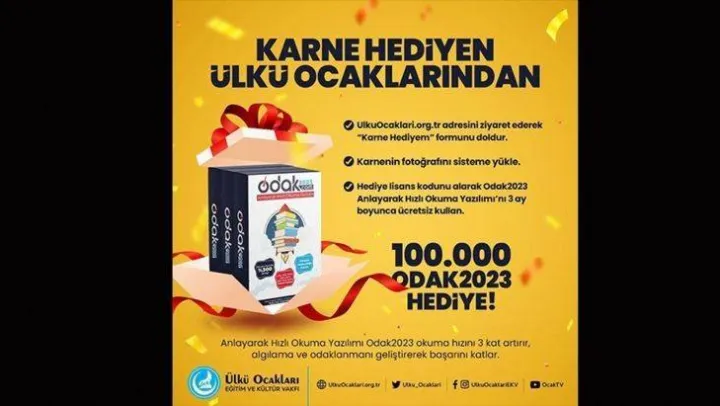 Ülkü Ocakları bu hediye vasıtasıyla öğrencilerin hem tatillerini verimli geçirmesi hedefliyor hem de yeni dönem eğitim öğretim hayatında başarılı olmaları için bir adım olarak planlanıyor. Bu çerçevede ise tam 100 bin öğrenciye ODAK2023 Anlayarak Hızlı Okuma yazılımı kodu hediye edilecek.