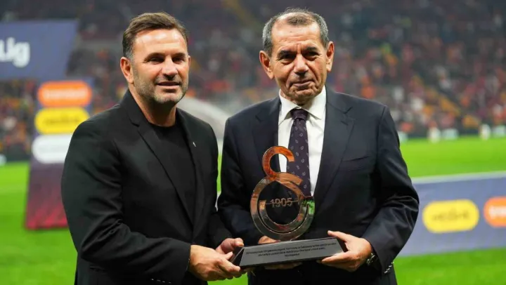 Galatasaray Başkanı Dursun Özbek, Galatasaray Teknik Direktörü Okan Buruk'a, sarı-kırmızılılarla 100. galibiyetine ulaşmasından dolayı plaket takdim etti.