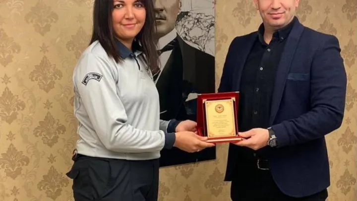 Bilecik'te güvenlik görevlisi olan bayan okul çevresinde dolaşan kişilere anında müdahale ederek uzaklaştırmasına karşılık ödül geldi.