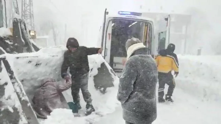 Ordu'da hastalanan kadın, karla kaplı yolda kepçe ile ambulansa taşındı
