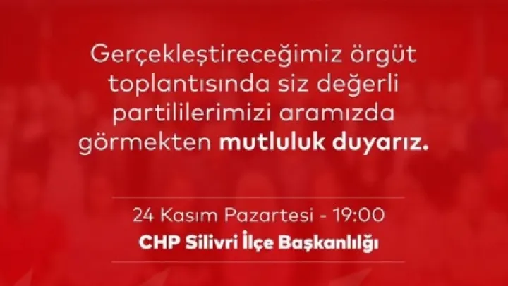 Cumhuriyet Halk Partisi Silivri İlçe Başkanlığı, 24 Kasım Pazartesi günü gerçekleştirilecek örgüt toplantısı için tüm parti üyelerine çağrıda bulundu. İlçe Başkanı Doruk Bulut, toplantıda partilileri bir arada görmekten büyük mutluluk duyacaklarını belirterek katılımın önemine dikkat çekti.