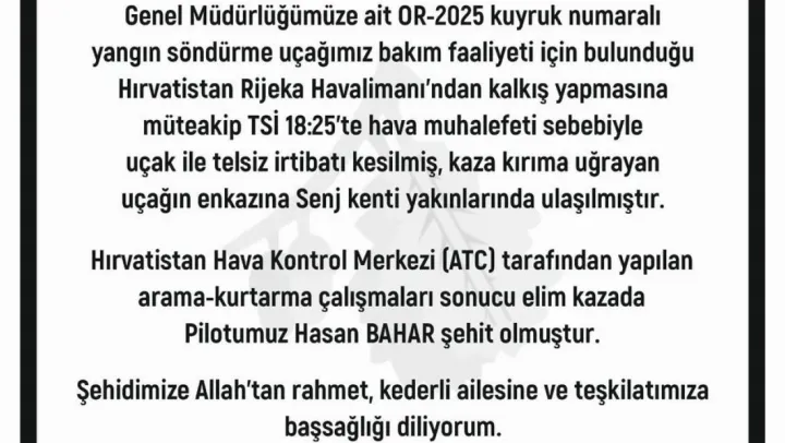 Orman Genel Müdürü Karacabey sosyal medya hesabından yaptığı paylaşımında, 'Genel Müdürlüğümüze ait OR-2025 kuyruk numaralı yangın söndürme uçağımız bakım faaliyeti için bulunduğu Hırvatistan Rijeka Havalimanı'ndan kalkış yapmasına müteakip saat 18.25'te hava muhalefeti sebebiyle uçak ile telsiz irtibatı kesilmiş, kaza kırıma uğrayan uçağın enkazına Senj kenti yakınlarında ulaşılmıştır. Hırvatistan Hava Kontrol Merkezi (ATC) tarafından yapılan arama-kurtarma çalışmaları sonucu elim kazada Pilotumuz Hasan Bahar şehit olmuştur. Şehidimize Allah'tan rahmet, kederli ailesine ve teşkilatımıza başsağlığı diliyorum' ifadelerini kullandı.
