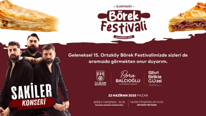 Silivri Belediyesi tarafından bu yıl 15'incisi düzenlenecek Ortaköy Börek Festivali, 22 Haziran 2025 Pazar günü Ortaköy Meydanı'nda gerçekleştirilecek. Selanik usulü 'patriyot' böreğini yaşatmayı amaçlayan festivalde geleneksel tariflerin yarıştığı özel bir börek yarışması ve sevilen müzik grubu Sakiler'in sahne performansı yer alacak.