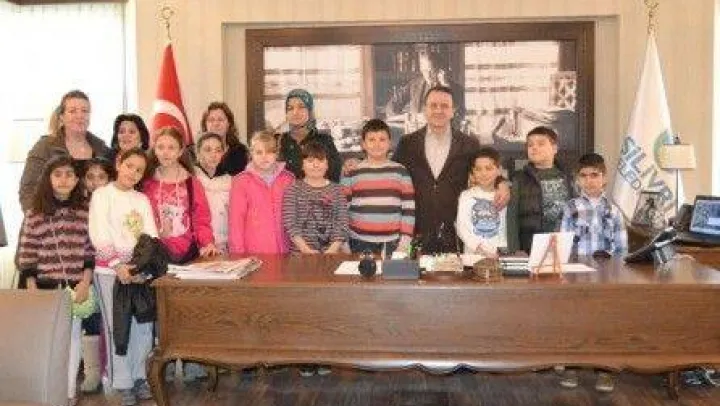 Ortaköy Sezin Öztaş İlkokulu 3-B sınıfı öğrencileri Silivri Belediye Başkanı Özcan Işıklar'ı makamında ziyaret ederek, hazırladıkları okul dergisi için ilçede yapılan hizmetler hakkında bilgi aldılar.
