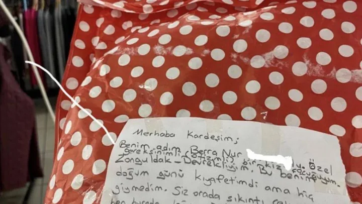 'Merhaba kardeşim benim adım Berranur otizmli bir bireyim. Zonguldak Devrekliyim. Bu benim doğum günü kıyafetim. Siz orada sıkıntı yaşarken burada ben bunu giyemem. Sizlere çok dua ediyorum. Sizin yaralarınızı saramayız ama kalbimiz daima sizinle. Bir nebze olsun içinizi ısıtmak istedim.'