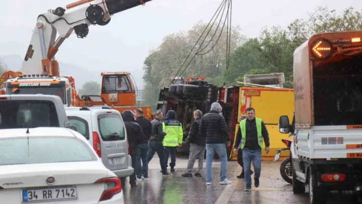 Anadolu Otoyolu Sakarya geçişinde kontrolden çıkan tır, bariyerlere çarparak devrildi. Meydana gelen kaza sonrasında kilometrelerce oluşan araç kuyruğunda sürücüler kontak kapattı. Tırın bölgeden kaldırılma çalışmaları devam ederken kaza anı güvenlik kamerasına yansıdı.