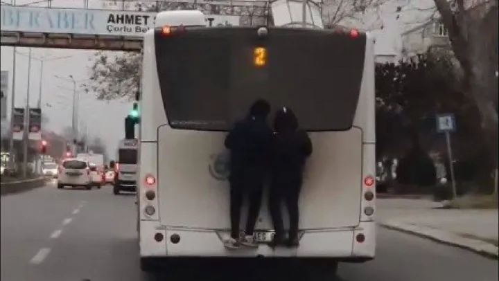Trafikte seyreden halk otobüsüne tutunarak yolculuk eden iki genç, başlarına gelebilecek kaza tehlikesini umursamadı. Çorlu ilçesi Kazımiye Mahallesi Salih Omurtak Caddesi üzerinde iki gencin, otobüsün arkasına tutunarak yolculuk ettiği o anlar, bir vatandaşın telefon kamerasına takıldı. İlçenin işlek yollarından Salih Omurtak Caddesi üzerinde bir vatandaş tarafından çekilen görüntüde, iki gencin halk otobüsünün arka kaportasına çıkarak yolculuk ettiği gözlendi. Kaza tehlikesi umurunda bile olmayan iki gencin tehlikeli yolculuğu, görenlerin yüreğini ağzına getirdi. Kazaya davetiye çıkaran bu gençlerin umursamaz tavırları dikkat çekerken, trafiği tehlikeye düşürdükleri yetmediği gibi sürücü ve vatandaşların da sinirlerini gerdi.