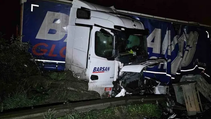 Anadolu Otoyolu Sakarya geçişinde yağış sebebiyle kontrolden çıkarak makaslayan tır, yol kenarındaki bariyerlere çarptı.