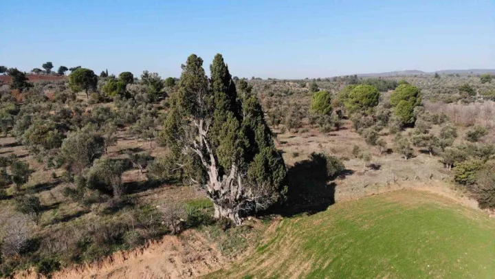 Çanakkale'nin Ezine ilçesine bağlı Pazarköyü sakinleri, 9 metrelik gövde çapı ve yaklaşık 30 metrelik yüksekliğiyle 2 bin 500 yıllık olduğu tahmin edilen selvi ağacının tescillenip koruma altına alınmasını istiyor.