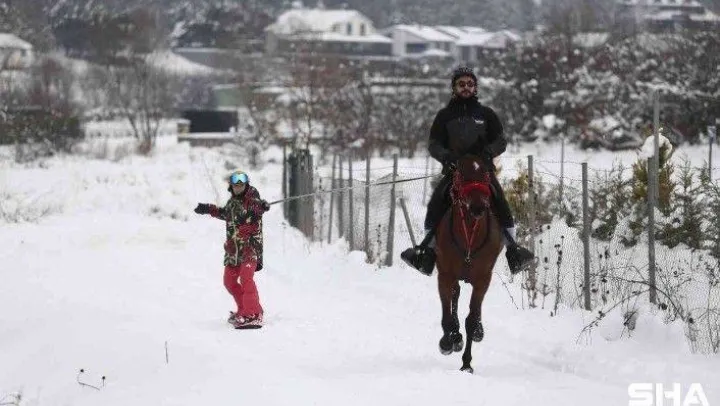 Uludağ'ın eteklerinde bir binicilik merkezinde atlı snowboard yapılmaya başlandı. At binme ve snowboard sporlarını bir araya getiren bu faaliyet havadan drone ile görüntülendi. Bir at tarafından çekilen snowboardçu, yokuş yukarı ve düz zeminde kayak yapmanın da keyfini çıkartıyor.