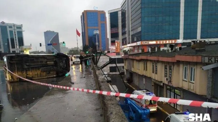 Bağcılar'da bir köprünün üzerinde ilerleyen panelvan araç, yağıştan dolayı kayganlaşan yolda kontrolden çıkarak bariyerlere çarpıp yan yattı. İçindekiler ise çarpmanın etkisiyle araçtan fırlayarak köprüden aşağıya düşüp yaralandı.