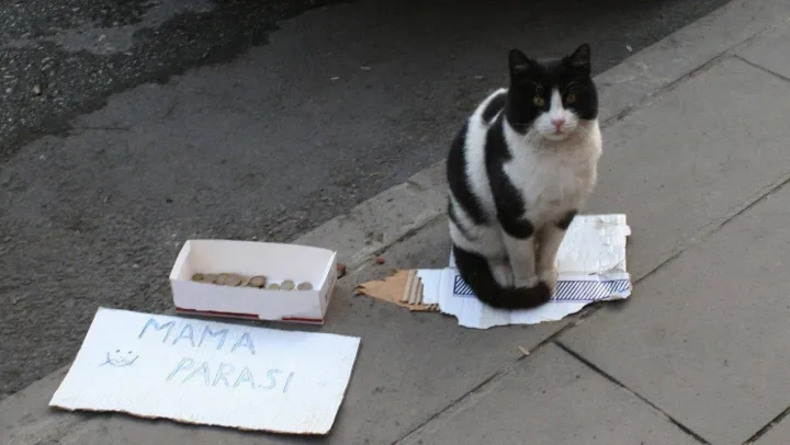 (ÖZEL) Bu kedi mama parası biriktirmek için kaldırımda bekliyor