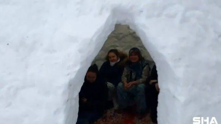 Bursa'nın İznik ilçesinde oturduğu mahalleye eskimo evi yapan emekli öğretmenin kapısından misafiri eksik olmuyor. Torunlarıyla birlikte 4 günde tamamladığı eskimo evine ailece taşınan Mümin Ergül kardan evde sıra gecesi bile yapıyor.