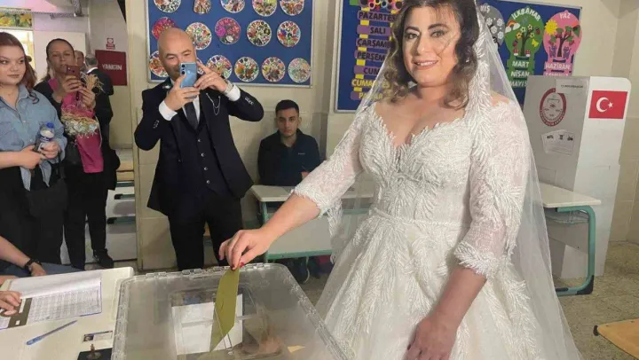 Bursa'da düğün öncesi gelinliği ve damatlığıyla Cumhurbaşkanlığı seçimi için oy kullanmaya giden yeni çiftler renkli görüntüler oluşturdu.