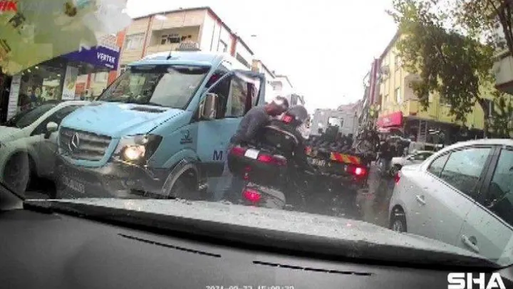 Ataşehir'de sokak üzerinde ilerleyen hatlı minibüs şoförü ile motosikletli arasında çıkan tartışma ilginç anlara sahne odu. Tartışma esnasında minibüsçü aracından inerek kasklı motosiklet sürücüsüne kafa attı. Motosiklet sürücüsü kendisine atılan kafadan etkilenmezken, minibüsçünün yaralanma pahasına kaska kafa atması görenleri şaşırttı. O anlar kameraya anbean yansıdı.