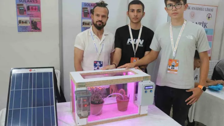 Projeyi anlatan lise öğrencisi Eren Kayabaşı, 'Projenin ismi 'Solares'. İsmi solar paneli ve sera birleşiminden geliyor. Yenilenebilir enerji kaynaklarını kullanıyoruz ve israfı daha aza indirmek için bu projeyi geliştirdik. Çiftçilerimiz evinden tarlalarına gitmeleri için bir enerji sarf etmeleri gerekiyor. Bu enerjiyi en aza indirmek için uzaktan kontrol yaptık. Burada oluşturduğumuz mini serada değerleri uzaktan izleyebiliyoruz. Seramızda botanik bitkilerinden olan kaktüs ve bir adet çiçek kullandık. Kaktüs normal bir çiçeğe göre daha az su ister. Kaktüs ve çiçeğe ayrı bir sulama sistemi yaptık. Kaktüsü ayrı ölçebiliyoruz ve iki ayrı su pompamız var, bu su pompalarından da sulama işlemi sağlayabiliyor. Su haznemizin içerisinde bir adet su sensörümüz var. Bu sensör sayesinde su seviyesi belirli bir miktarın altına düştüğü an bize alarm vermesini sağladık. Alarmın yanı sıra telefonumuza da bildirim geliyor. Bu şekilde de su tankımıza su eklemesi yapabiliyoruz. Güneş ışınlarının az olduğu ortamlarda bitkilerin fotosentezi sağlayabilmesi için biz seramızda ultraviyole ışık kullandık. Ultraviyole ışıklar güneş kadar olmasa da fotosenteze destek sağlayabiliyor. Telefonumuzdaki uygulamada çiçeklerin değerlerini ve nemlerini ayrı ayrı bize gösterebiliyor' şeklinde konuştu.