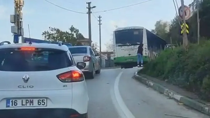 Bursa'da paten ile kayan bir genç yorulunca otobüsün arkasına tutunarak seyahat etti. Âdet ölümle dans eden genci görenler, o anları anbean kayda aldı.