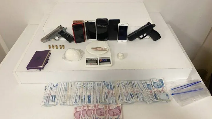 Operasyonda, M.B., E.C., E.Ç. ve B.A. isimli şahıslar yakalandı. Aramalarda ise; 175 gram metamfetamin, 1.8 gram eroin, 1 adet hassas terazi, 6 adet cep telefonu, 11 bin 905 TL para, 1 adet havalı tabanca, 1 adet ruhsatsız tabanca ile bu tabancaya ait şarjör ve 5 adet fişek ele geçirildi.