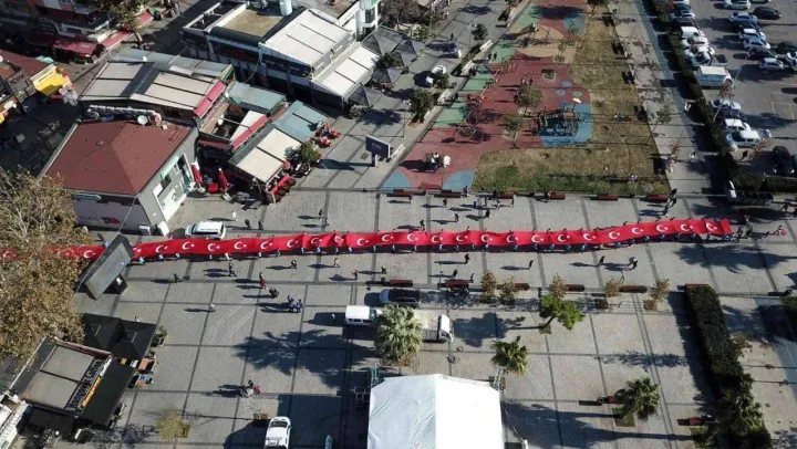 Pendik'te sokaklarda taşınan 99 metrelik dev Türk bayrağı havadan görüntülendi