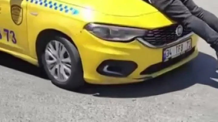 Görüntülerde araç sürücüsünün taksi kaputu üzerine çıkarak camı yumrukladığı görülüyor.