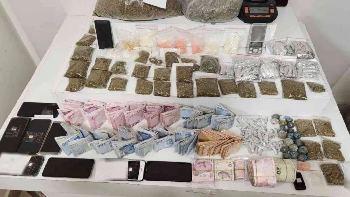 Araç sahibi olan F.Ö. isimli şahsın adresinde ve 4 farklı ikamette yapılan aramalarda, 3 kilo 464 gram bonzai, 538 gram metanfetamin, 410 adet extacy 142 gram, 29 gram nevi belli olmayan uyuşturucu madde, 3 adet hassas terazi ele geçirildi.