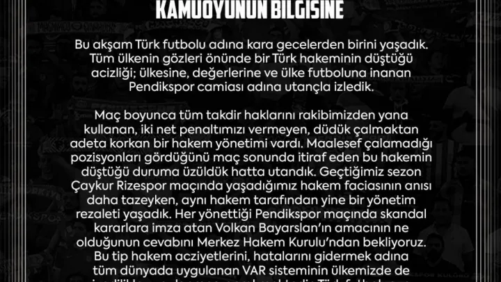'Bu akşam Türk futbolunun adına kara gecelerden birini yaşadık. Tüm ülkenin gözleri önünde bir Türk hakeminin düştüğü acizliği; ülkesine, değerlerine ve ülke futboluna inanan Pendikspor camiası adına utançla izledik. Maç boyunca tüm takdir haklarını rakibimizden yana kullanan, iki net penaltımızı vermeyen, düdük çalmaktan adeta korkan bir hakem yönetimi vardı. Maalesef çalamadığı pozisyonları gördüğünü maç sonunda itiraf eden bu hakemin düştüğü duruma üzüldük hatta utandık. Geçtiğimiz sezon Çaykur Rizespor maçında yaşadığımız hakem faciasının anısı daha tazeyken, aynı hakem tarafından yine bir yönetim rezaleti yaşadık. Her yönettiği Pendikspor maçında skandal kararlara imza atan Volkan Bayarslan'ın amacının ne olduğunun cevabını Merkez Hakem Kurulu'ndan bekliyoruz. Bu tip hakem acziyetlerini, hatalarını gidermek adına tüm dünyada uygulanan VAR sisteminin ülkemizde de ivedilikle uygulanması gerekmektedir. Türk futbolunun marka değerini yükseltecek yegane faktör saha içinde adaletin sağlanmasıdır' denildi.