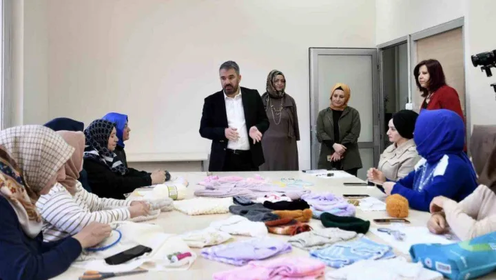 Pursaklar Belediyesine bağlı Hanım Evlerinde eğitim gören kursiyerler, deprem bölgelerinden ilçeye gelen afetzedeler için kıyafet örüyor.